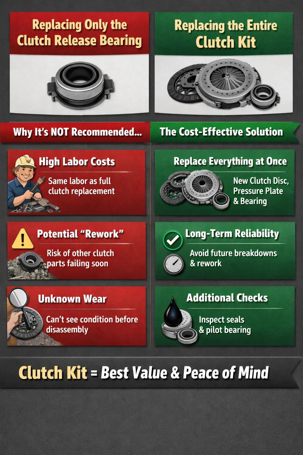 La vida útil de las piezas del sistema de embrague (placa de presión, disco de embrague, cojinete de desembrague) suele ser similar. Si esta vez sólo reemplaza el rodamiento y el disco de embrague se desgasta y patina unos meses después, tendrá que pagar nuevamente los altos costos de mano de obra para quitar la transmisión, lo cual es muy antieconómico a largo plazo.