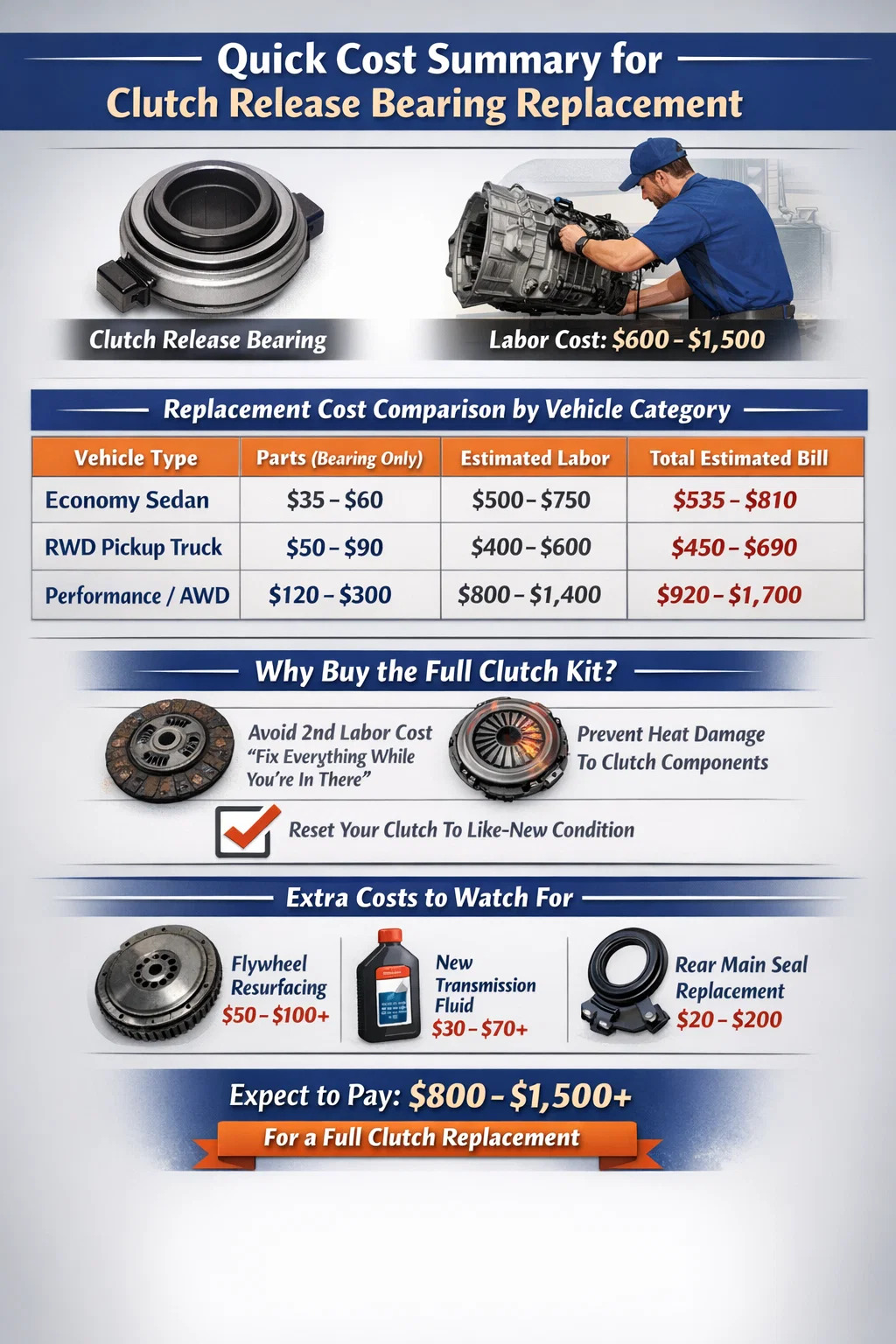 En conclusión, aunque es posible que sólo necesites gastar $50 en lo real cojinete de desembrague , la realidad del trabajo mecánico involucrado significa que su presupuesto debe estar preparado para una reparación de cuatro cifras. Saltarse el kit de embrague completo es a menudo una apuesta que termina pagando el doble de mano de obra más adelante.