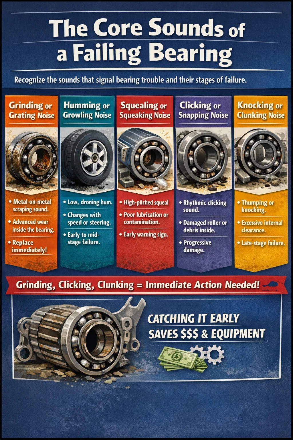 atrapando rodamiento El ruido temprano es la diferencia entre una pieza de $30 y una reparación de $3000. Un rodamiento que comienza con un leve zumbido puede progresar hasta agarrotarse por completo en unas semanas, causando daños secundarios a los husillos, cubos, ejes y carcasas. Los sonidos descritos en esta guía se aplican tanto a los rodamientos de ruedas de automóviles, como a los de motores, de maquinaria industrial y de electrodomésticos; la física de la falla es la misma en todos ellos.