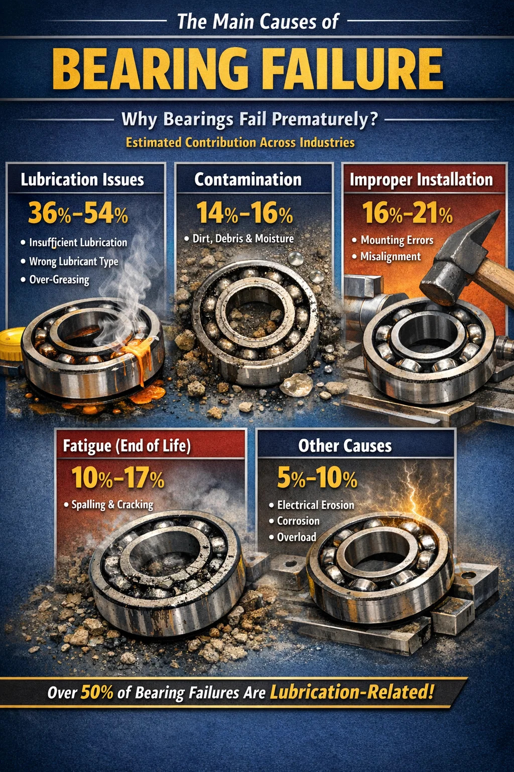 Dicho esto, las fallas de los rodamientos rara vez son causadas por un solo factor aislado. Los problemas de lubricación a menudo desencadenan o aceleran otros modos de falla. Comprender el espectro completo de causas (y cómo interactúan) es esencial para cualquiera que maneje equipos rotativos, ya sea en una planta de fabricación, una turbina eólica, una transmisión de automóvil o una línea de procesamiento de alimentos.
